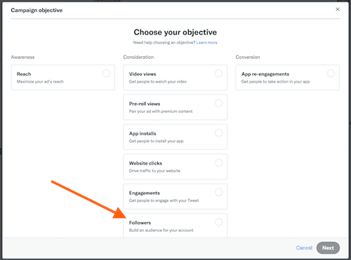 Twitter ads are awesome for growing a following on Twitter because they actually have it as an objective. You can specifically create campaigns with the sole purpose of growing your Twitter following.