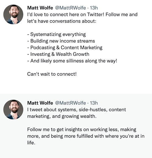 - Focus on only a few topics – If you really want to cultivate an engaged following, you need to post fairly niche content. People will follow you for what you talk about. Pick three topics and try to tweet about content related to those three topics. This makes it very clear to others on Twitter what value they will receive when they follow you. For me, it’s “Systems, side-hustles, and content marketing.” I can riff about those all day.