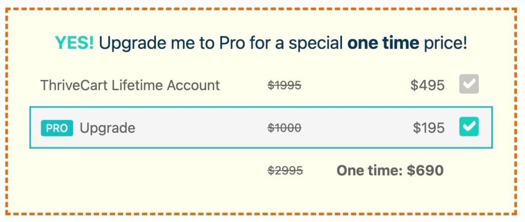 ThriveCart is a ONE-TIME PRICE! To get all the features, you’ll want to be on the Pro account, which is less than $700 total, with no monthly fees.
