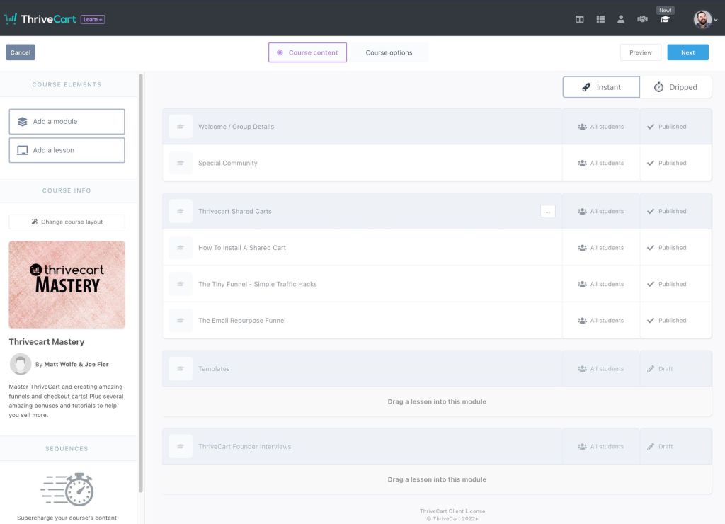 You can ditch Teachable or Thinkific. You can now build your membership site directly inside of ThriveCart. They rolled out a massive new feature for customers called “ThriveCart: Learn,” which allows you to build entire protected members areas directly inside of ThriveCart. Give access when people purchase, drip out content over a certain time, customize the membership design with the drag-n-drop builder, and do pretty much anything you could do with any other membership platform (for no additional monthly costs). This in itself is quite insane, seeing as the alternatives run you about $100/month.